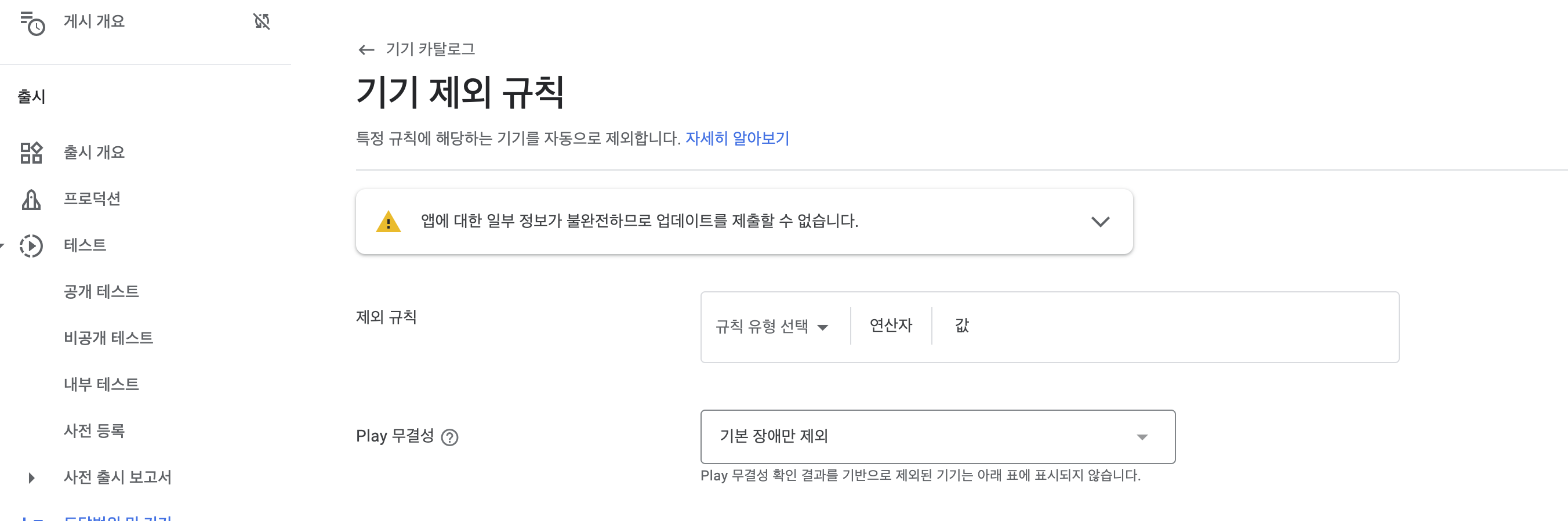 또는 구글 play 내부 기기 카탈로그에서 기기 제외 규칙을 사용해서 무결성 체크 시 이슈가 있는 것들을 제외하는 방법을 혼용하여 사용하였다