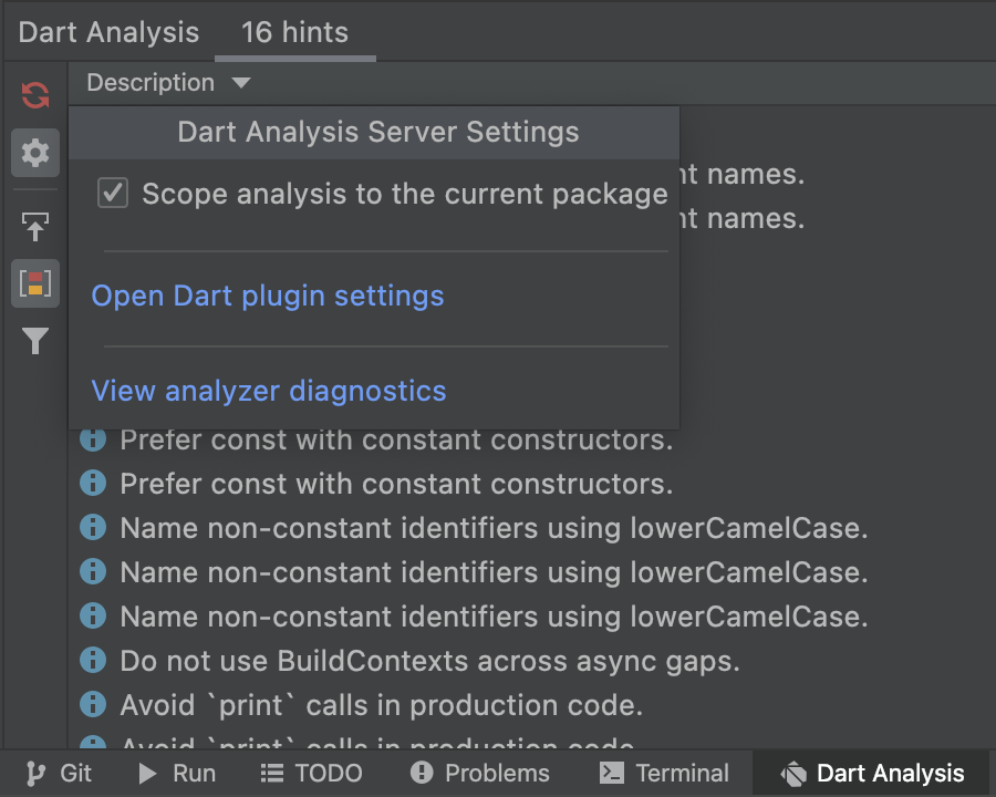안드로이드 스튜디오 하단부에 Dart Analysis 에서 설정 선택 후 Scope analysis to the current package 를 선택 해주면 다시 정상 작동한다